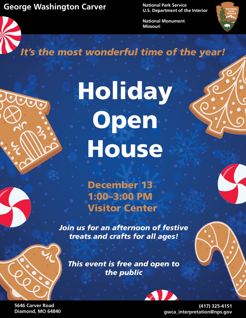 Come enjoy the holidays at George Washington Carver National Monument! Join park staff and volunteers for an afternoon filled with seasonal music, arts, and crafts, and festive refreshments. The event is free of charge.