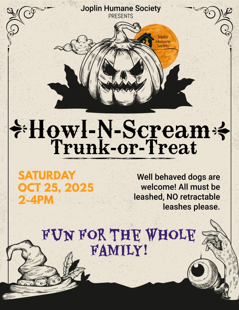 Get ready for a howlin' good time at Howl N Scream Trunk or Treat 2025 — hosted by Joplin Humane Society and sponsored by Blue Buffalo / General Mills!