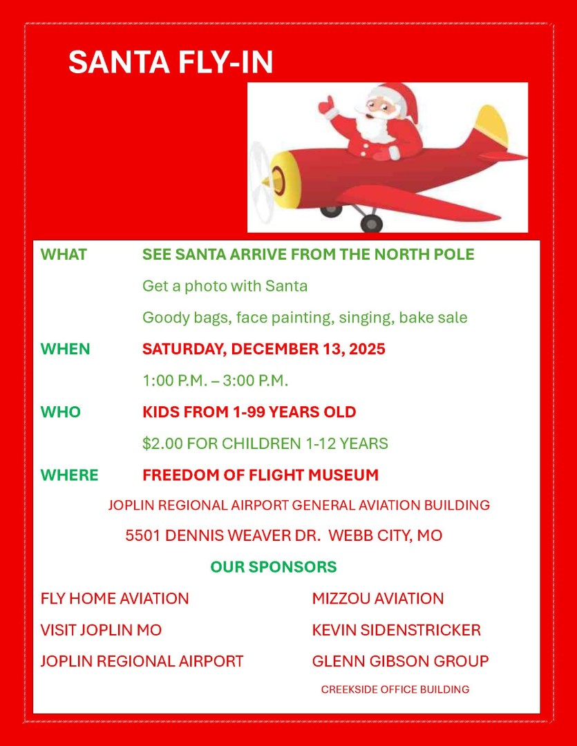 This special event commemorates Santa Claus’s memorable 1949 arrival in Joplin. That year, Santa delighted the community by coming to town in a bright yellow Piper Cub airplane. The reason for his airborne journey was simple—Santa’s elves were busy preparing his reindeer for their upcoming journey around the world on Christmas Eve. With his sleigh team otherwise engaged, Santa chose this unique method of travel to ensure he could check on Joplin’s preparations for his annual visit.