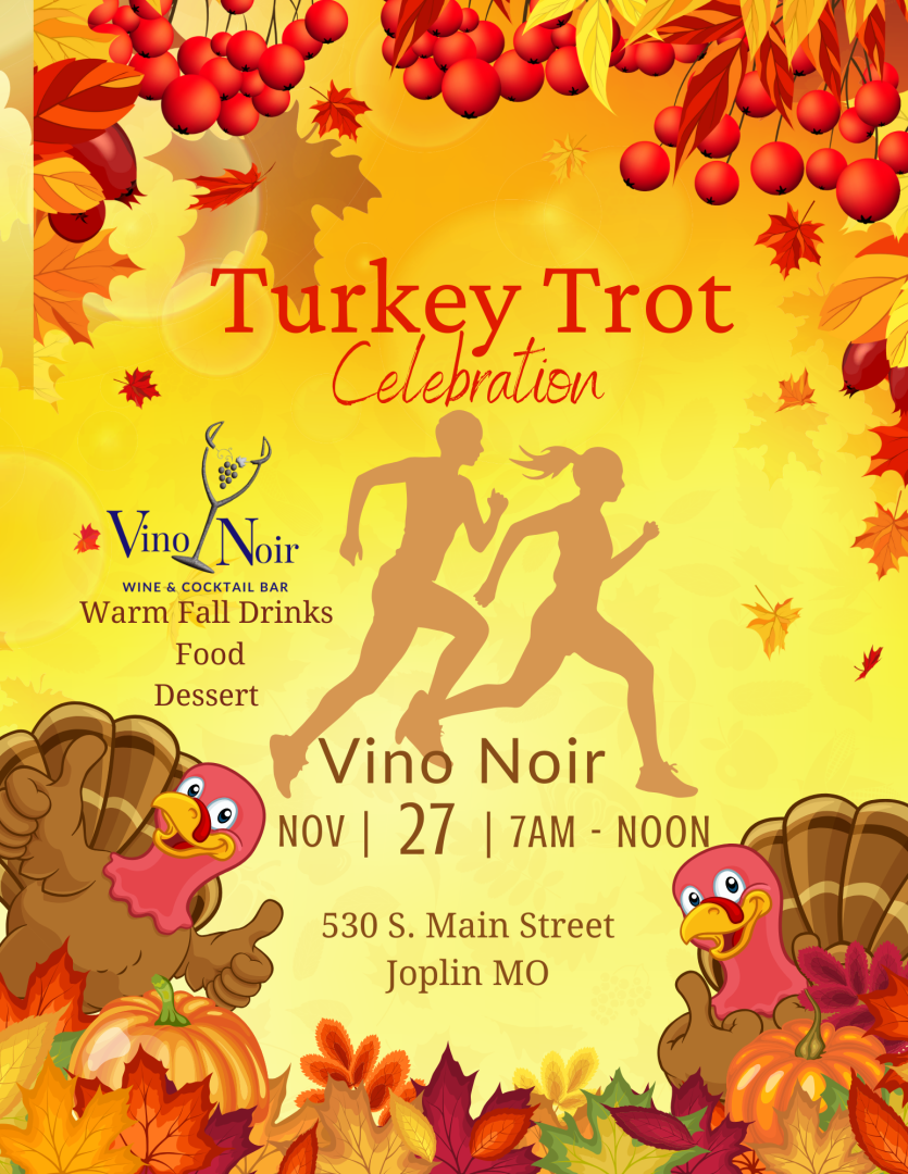 Start race day with a festive atmosphere at Vino Noir, featuring morning drinks, and a lively downtown setting to celebrate the Turkey Trot.